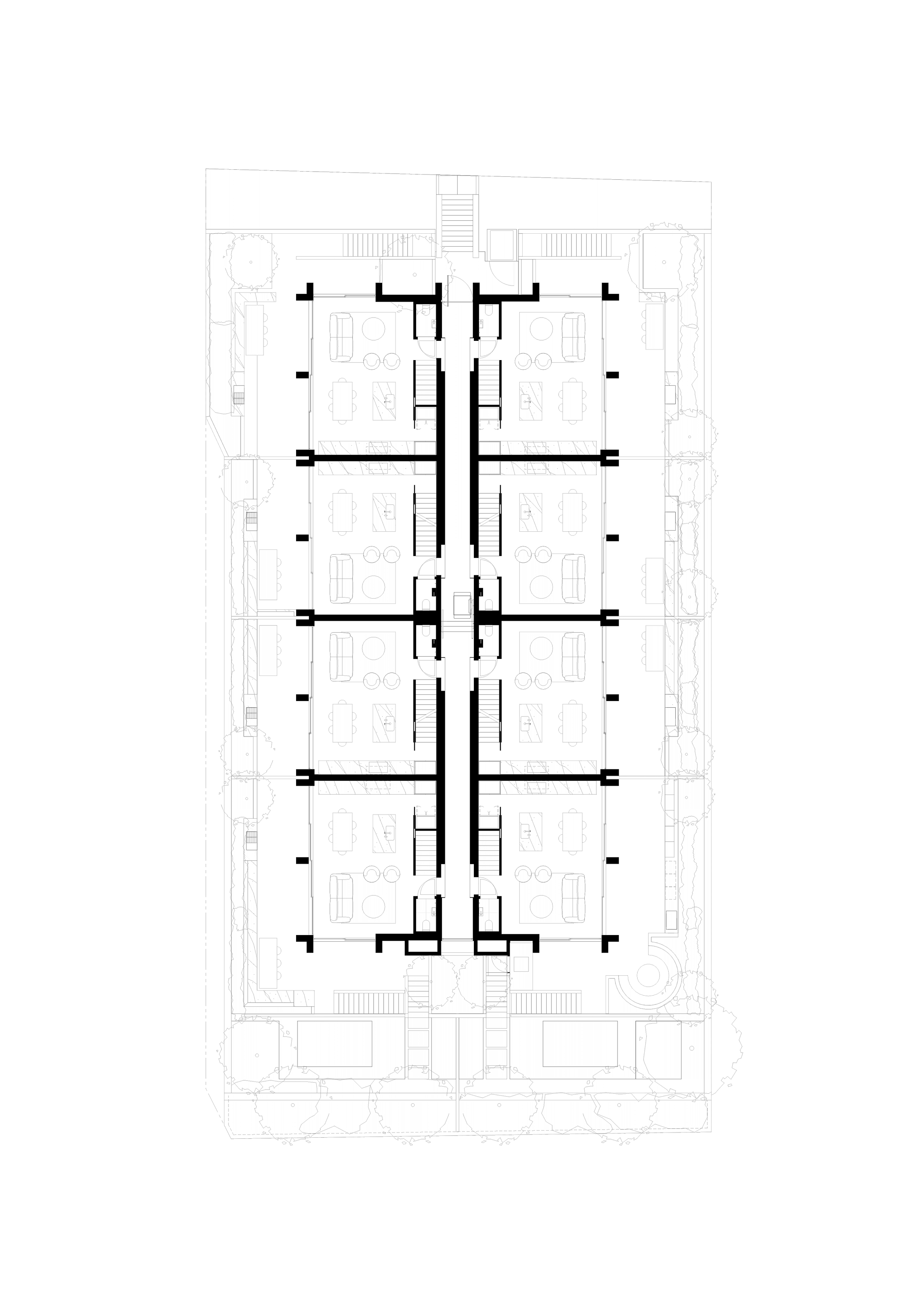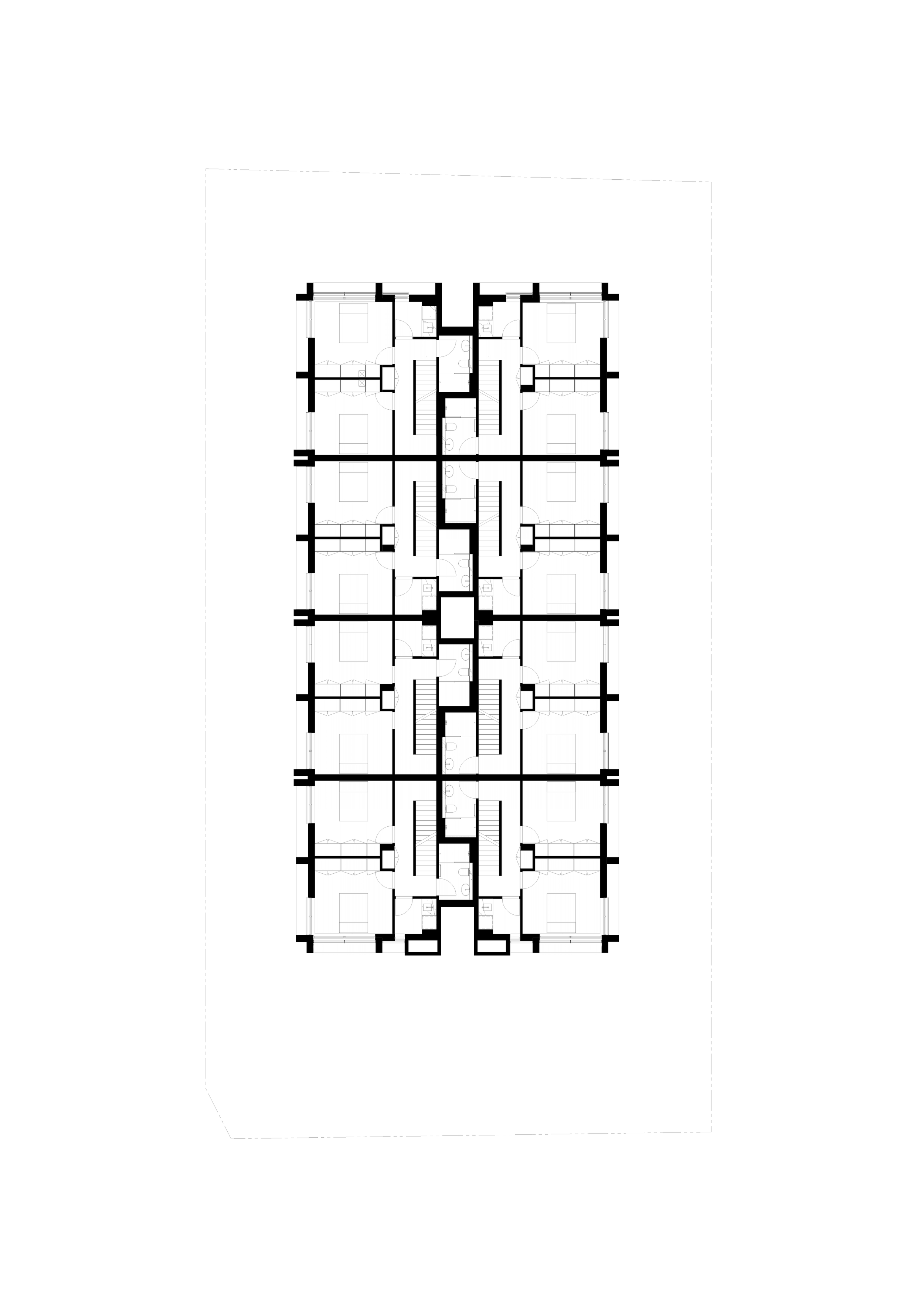 The narrow and long site meant the dwellings were arranged within a single built form. The dwellings were divided into two dual aspect dwellings at the front having city views and two dual aspect dwellings at the rear having landscaped external areas. Two dwellings were then oriented towards to southern boundary and two towards the northern boundary. A central circulation corridor was then placed through the centre to provide a clear entry, articulate the facade and provide efficient circulation to each dwelling.